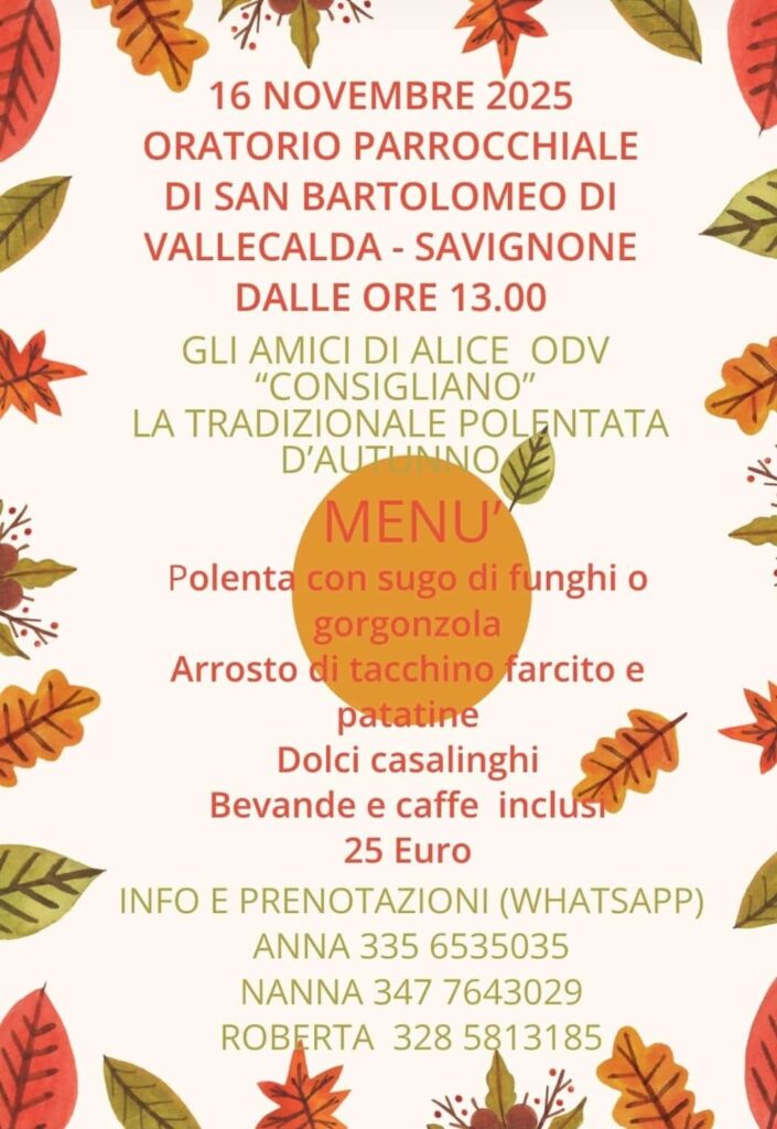 Domenica 16 novembre 2025, a partire dalle ore 13.00, presso l’Oratorio di San Bartolomeo – Savignone, gli Amici di Alice ODV vi aspettano per la tradizionale Polentata d’Autunno.