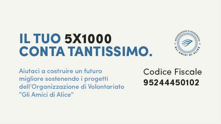 Nel momento della dichiarazione dei redditi, scegli di devolvere il tuo 5×1000 a Gli Amici di Alice ODV inserendo il nostro codice fiscale.