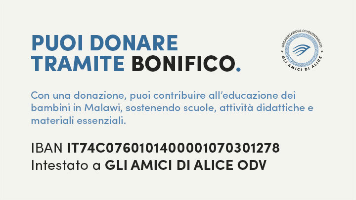 Sostenere Gli Amici di Alice ODV significa trasformare un gesto semplice in un aiuto concreto. Le tue donazioni ci permettono di portare avanti progetti educativi, sanitari e sociali in Italia e in Malawi: dall’Asilo di Alice alla Transitional Care per giovani pazienti onco-ematologici, fino alla realizzazione di spazi inclusivi per bambini fragili.